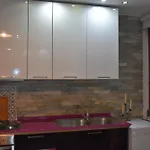На оборудованной кухне есть электрочайник, духовка и кухонная утварь.